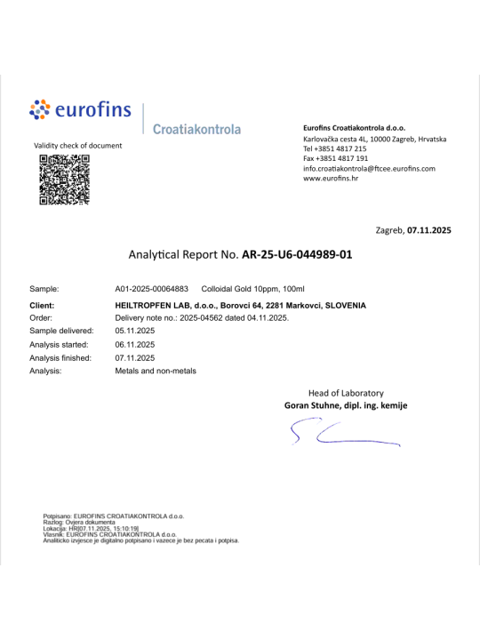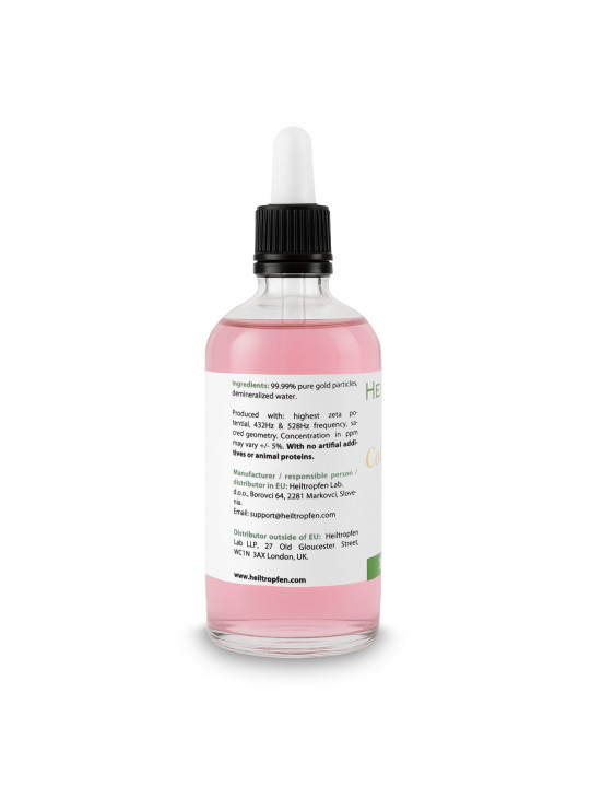 z elektrolizo, ki zagotavlja najvišjo kakovost, homogenost in stabilnost. To pomeni, da ni potrebna uporaba nobenih kemikalij ali stabilizatorjev. Rezultat te metode je visokokakovosten in dobro razpršen izdelek iz koloidnega zlata.